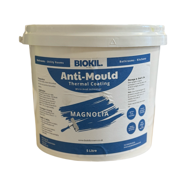 BIOKIL. Anti-Mould Thermal Coating is a high-performance interior wall and ceiling coating specifically developed to protect surfaces from unsightly and potentially harmful black mould and reduce the effects of condensation. Formulated with advanced acrylic copolymer technology and integrated biocides, this emulsion delivers long lasting hygiene protection in a smooth, washable matt finish. Its unique combination of fungicidal action and thermal-modified micro-bead technology enhances surface temperature, helping reduce condensation – a key trigger for mould.